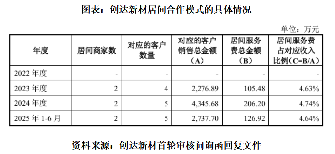 2023—2024年及2025年上半年,创达新材通过居间合作模式实现的销售金额分别为2276.89万元、4345.68万元、2737.70万元,对应的居间服务费分别为105.48万元、206.20万元、126.92万元。