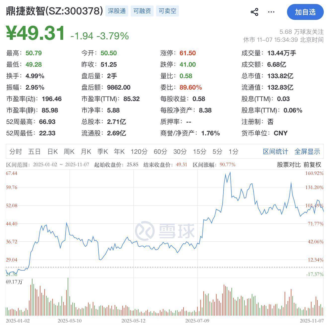 二级市场上,截至11月7日收盘,鼎捷数智下跌3.79%报49.31元/股,总市值133.82亿元。今年以来,公司股价已上涨90.77%。